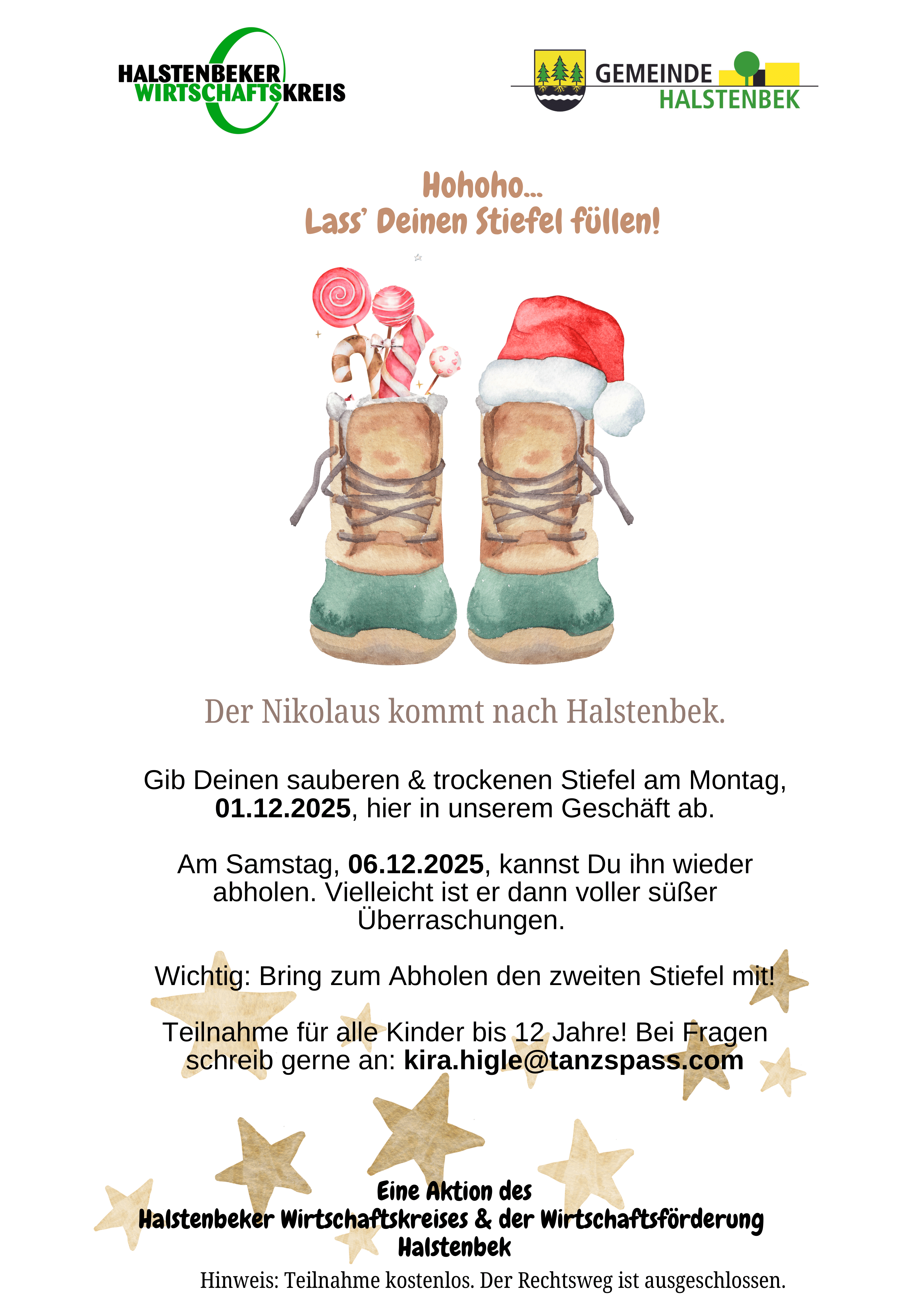 Hierfür kann jedes Kind bis 12 Jahre seinen sauberen Stiefel am Montag, den 01.12.25 in einem der unten genannten Geschäfte abgeben und erhält diesen dort ab Samstag, den 06.12. gefüllt zurück. Als „Beweis“ gilt der zweite Stiefel und wir bitten um Verständnis, dass jede Firma nur eine begrenzte Anzahl annehmen kann. Glücklicherweise gibt es aber ein paar Möglichkeiten und vielleicht lernt man auf diese Weise mal ein anderes Unternehmen in Halstenbek kennen.